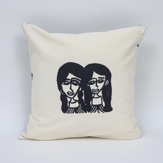 工房しょうぶで活動する鵜木二三子さんの絵画を使い、布にシルクスクリーンでプリントしたクッションカバーです。